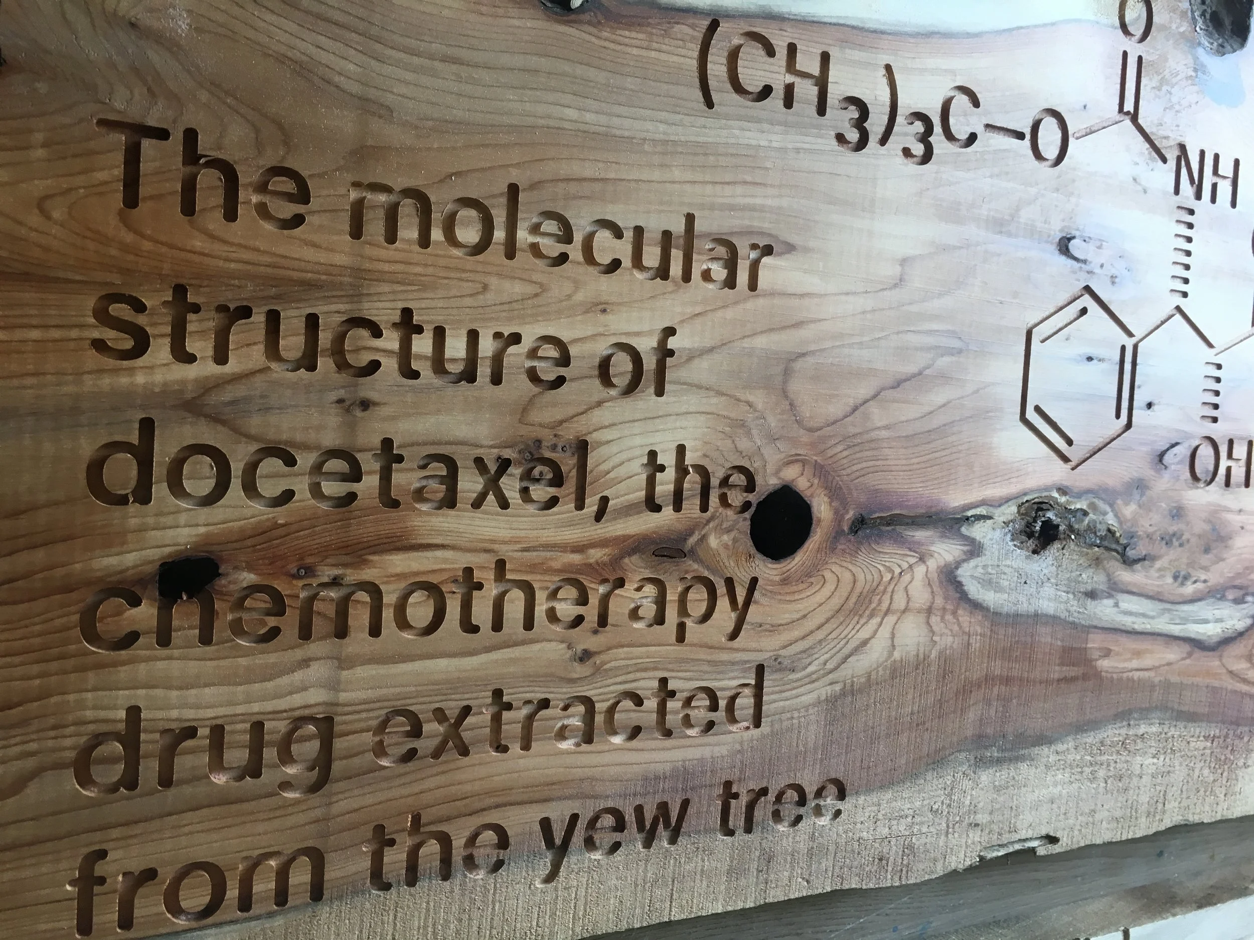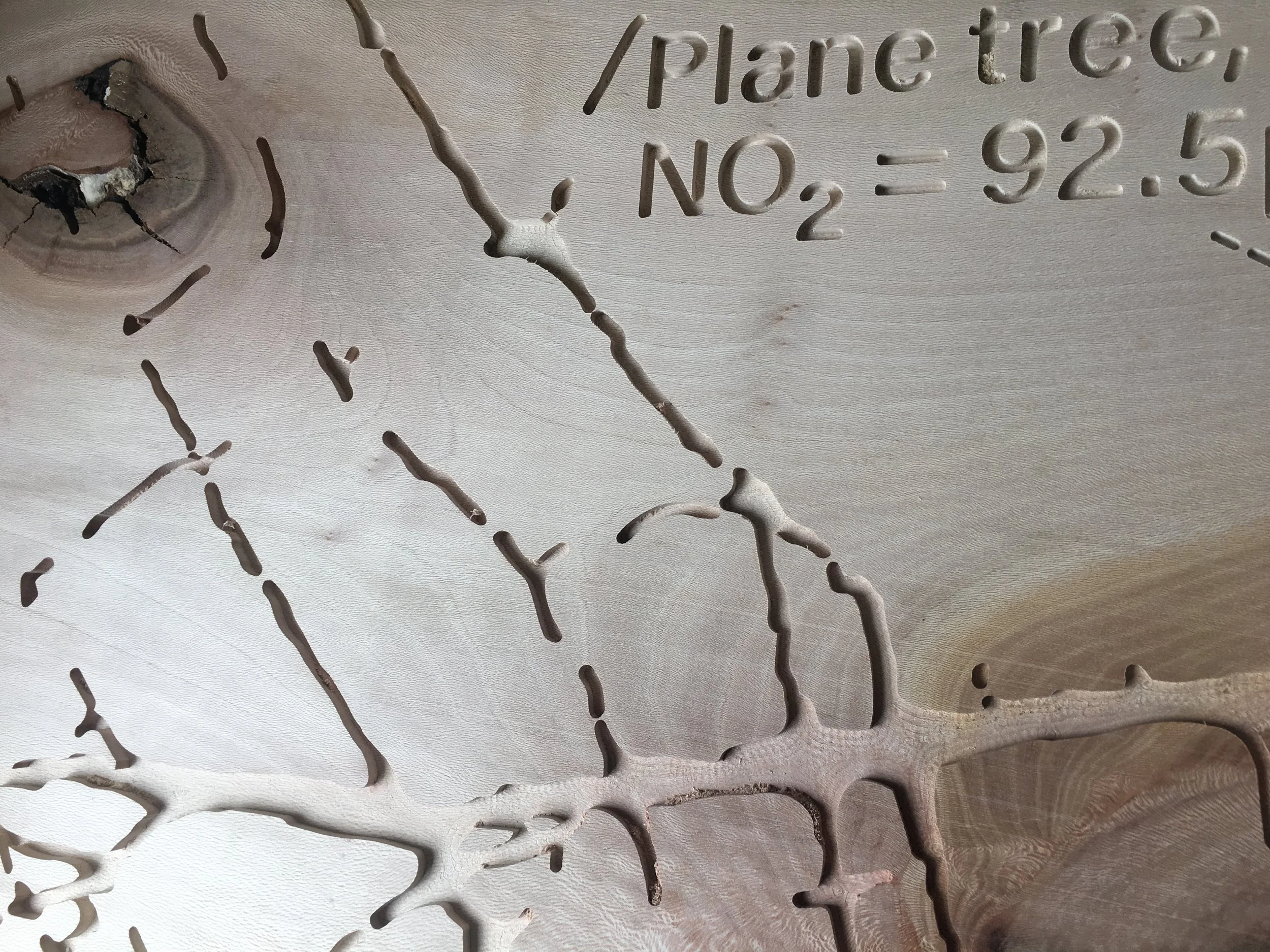 The London plane was felled in Euston, where air pollution was sixth worst in the UK. Air pollution data is engraved in the wood as a digital counterpoint to the residue from emissions in its bark. The oak slice contains both digital and organic information about biodiversity the tree supports. The yew’s bark and needles are toxic. We now know this property not only helps prolong the tree’s life, it means that yew extracts can be used in chemotherapy treatment.
