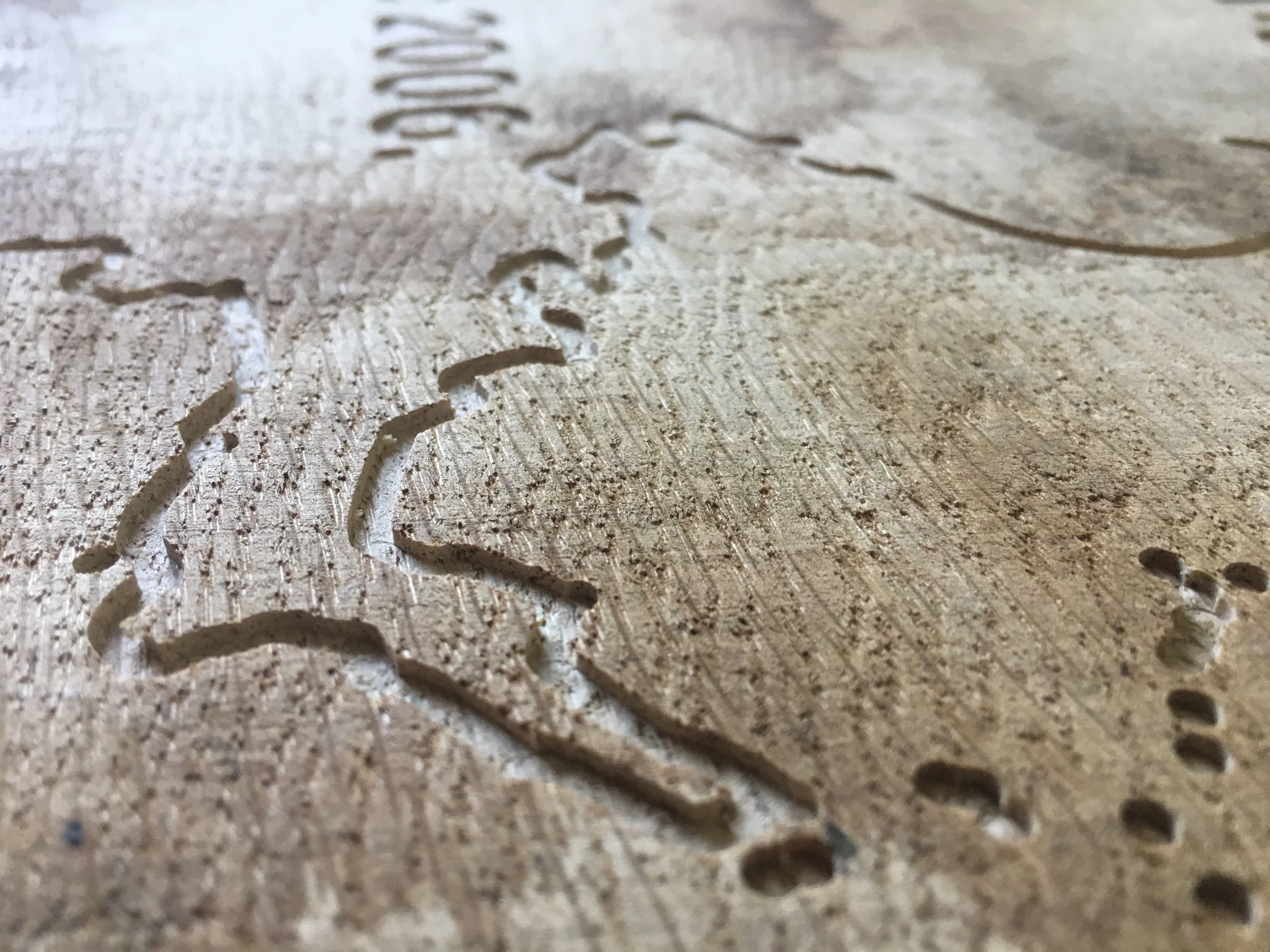 Arboreal is an installation by SRG Bennett, on display at the Royal Geographical Society as part of the Landlines show, 4th-14th September 2019. The work comprises three cross-sections of British trees, digitally engraved with data to complement the organic information they already hold.